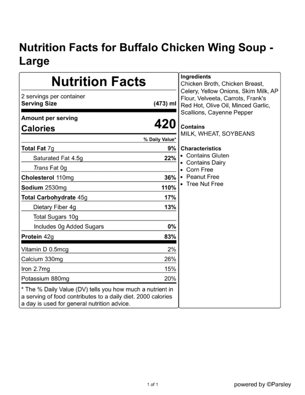Chicken Broth, Chicken Breast Boneless Skinless, Celery, Yellow Onions, Skim Milk, AP Flour, Velveeta, Carrots, Frank’s Red Hot, Olive Oil, Minced Garlic, Scallions, Cayenne Pepper