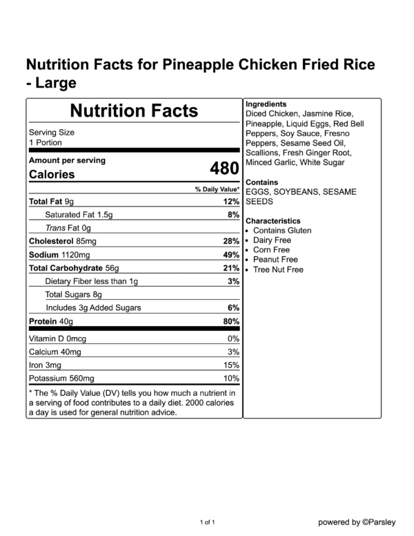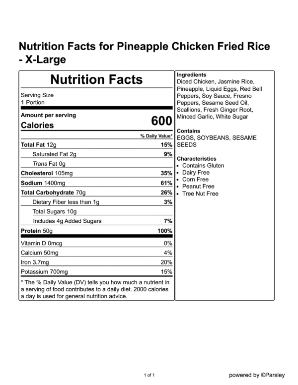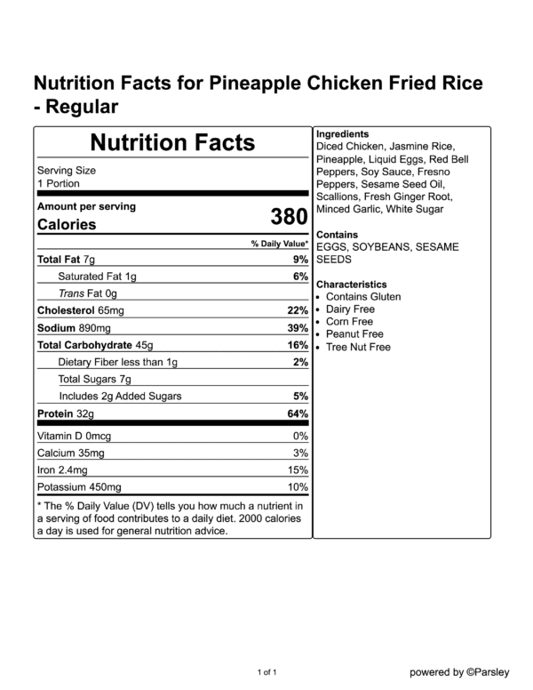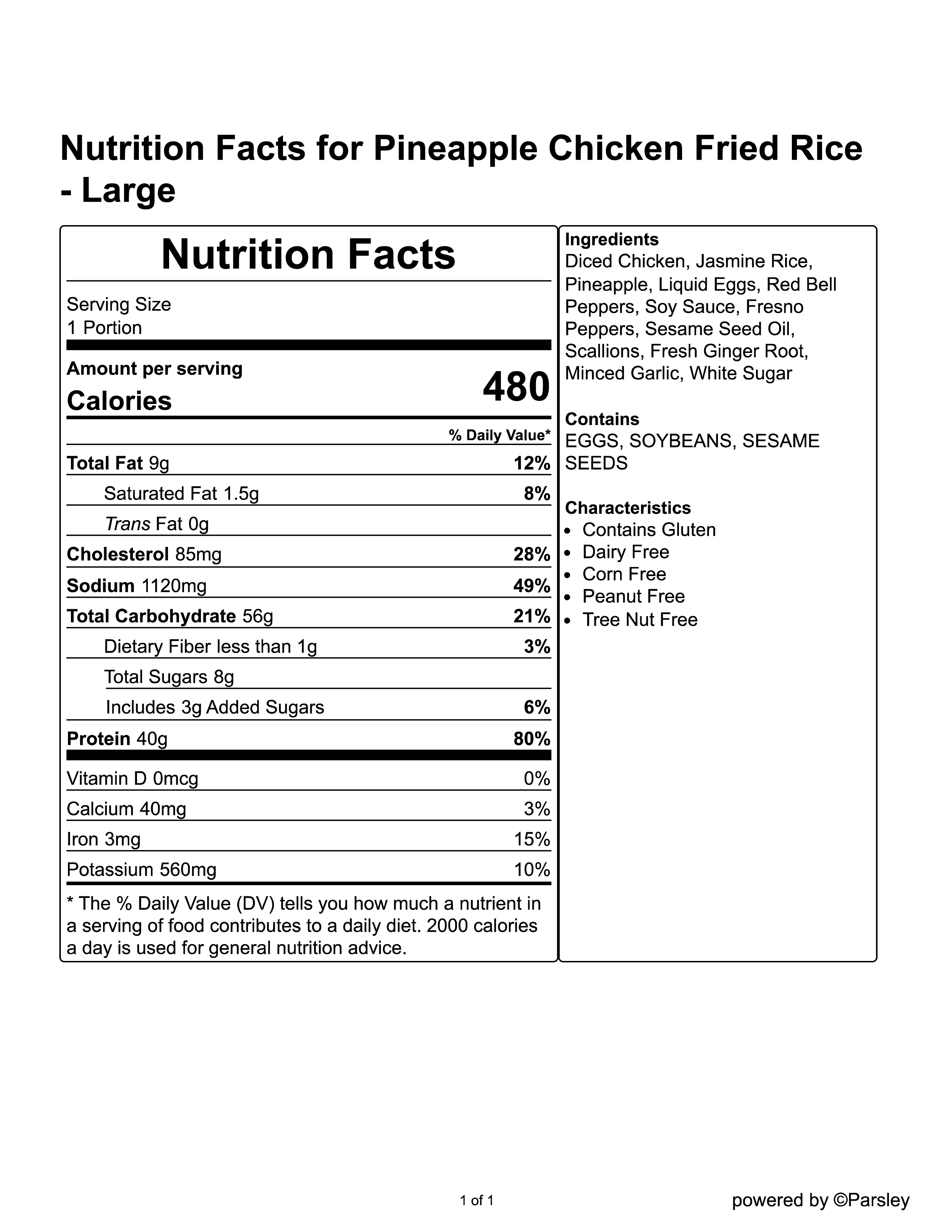 Diced Chicken, Jasmine Rice, Pineapple, Liquid Eggs, Red Bell Peppers, Soy Sauce, Fresno Peppers, Sesame Seed Oil, Scallions, Minced Garlic, Fresh Ginger Root, White Sugar